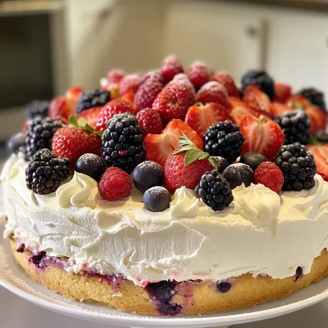 - Assemble the cake: layer with whipped cream and berries, then top with remaining berries. Chill briefly before serving.