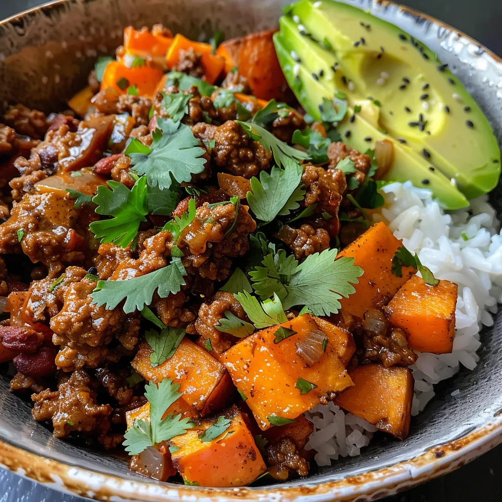 A delicious bowl filled with ground beef, sweet potatoes, and toppings like avocado and cottage cheese.